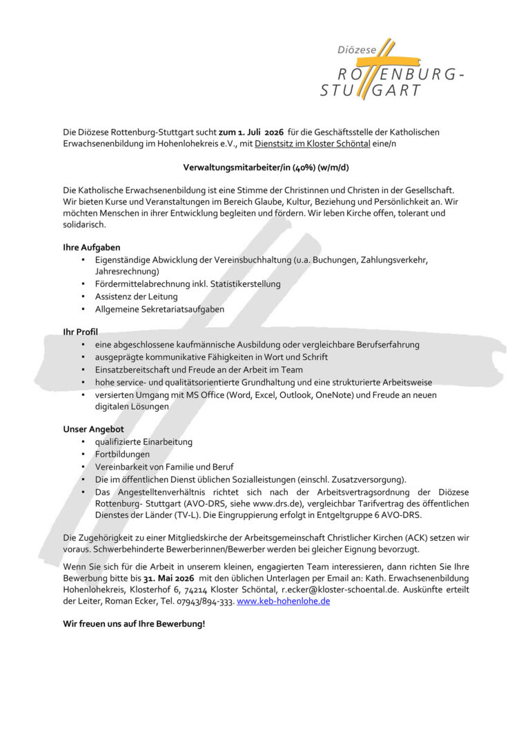 Die Diözese Rottenburg-Stuttgart sucht zum 1. Juli 2026 für die Geschäftsstelle der Katholischen Erwachsenenbildung im Hohenlohekreis e.V., mit Dienstsitz im Kloster Schöntal eine/n